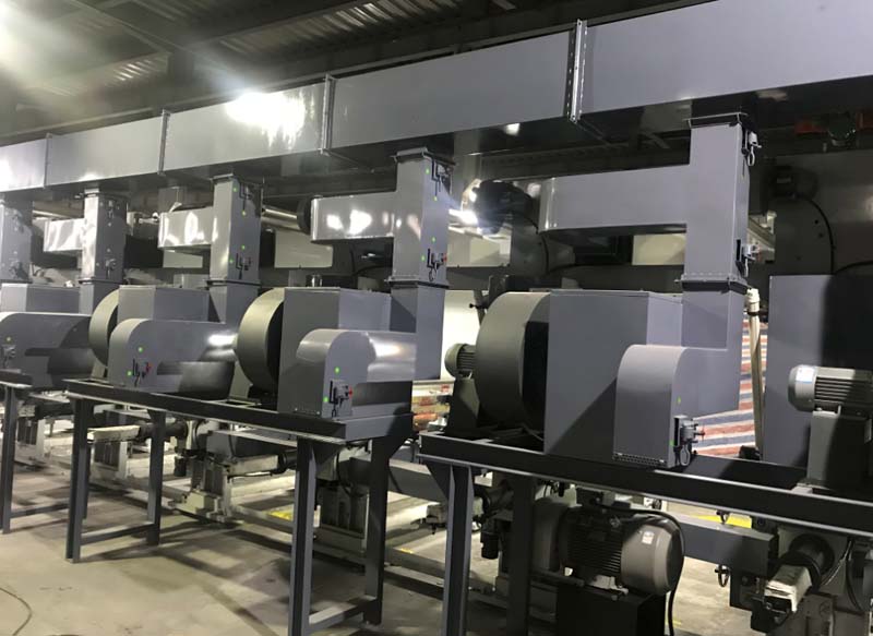 8.干燥、冷卻結構:烘箱采用離心機吹吸,電熱管分布在每組烘箱的吹風口進行加熱,烘箱內部形成風量熱循環,溫度由智能溫控儀控制,回頭輥用水冷卻式,確保薄膜降溫。循環再回收風,特點:節省用電。